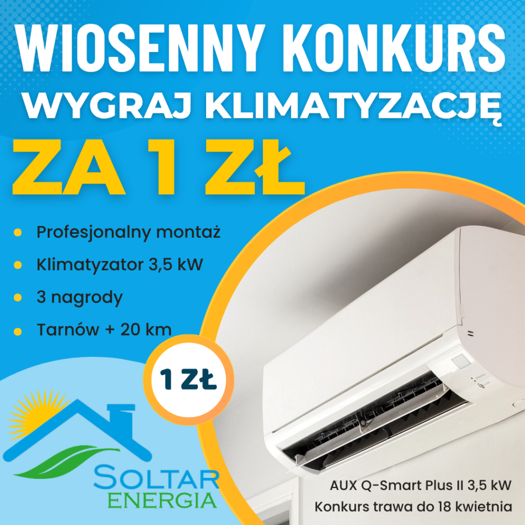 Wraz z nadejściem cieplejszych dni firma Soltar Energia przygotowała specjalny wiosenny konkurs dla mieszkańców Tarnowa i okolic. Do wygrania jest klimatyzator AUX Q-Smart Plus II o mocy 3,5 kW wraz z profesjonalnym montażem w cenie symbolicznej 1 zł. Jeśli planujesz montaż klimatyzacji w domu lub mieszkaniu w Tarnowie, to doskonała okazja, aby spróbować szczęścia i wygrać kompletną instalację klimatyzacji przed sezonem letnim. Konkurs skierowany jest do mieszkańców Tarnowa oraz miejscowości znajdujących się w promieniu do 20 km od Tarnowa.